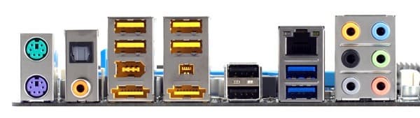 А на задней панели размещены два порта USB 3.0 фирменного синего цвета. Не забыты и FireWire обоих типов, есть пара eSATA, причем не в ущерб количеству внутренних SATA-портов, поскольку организованы они не за счет чипсетных, а с помощью дополнительного контроллера. Наконец, из числа приятных мелочей — оптический и коаксиальный S/PDIF. Похоже, с таким оснащением разработчики хотят угодить всем, и плата действительно претендует на уникальность в своем роде.