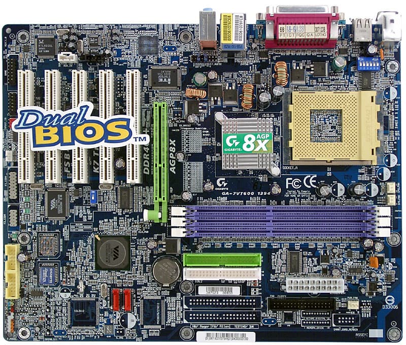 Компания Gigabyte выпускает три модели на базе чипсета VIA KT600, но две другие основаны на иной PCB, обладая минимальной функциональностью: у 7VT600 в наличии только 6-канальный звук на кодеке от Avance Logic, а у 7VT600-L еще распаян 100-мегабитный сетевой контроллер; к тому же для обеих используется южный мост VT8235 (то есть всего 6 портов USB 2.0 и отсутствует поддержка SATA). Однако и у описываемой платы имеется несколько разведенных, но нераспаянных элементов (например, контроллер IDE RAID и Gigabit LAN), причем на текущий момент в арсенале компании нет модели, в которой они были бы задействованы (а смысла в использовании также нераспаянного контроллера SATA RAID и вовсе нет, когда применяется южный мост VT8237). Дело тут в том, что PCB наиболее функциональных серий (1394, Ultra, Ultra2) не менялась со времен чипсета KT400, и плата на каждом новом чипсете получается всего лишь заменой северного и/или южного моста (но не переразводкой).