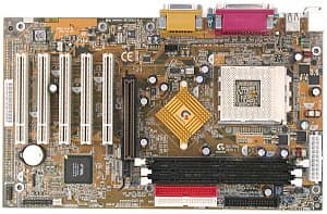 Маленькая аккуратная плата на KT133A в простой коробке без изысков — все говорит о том, что это не хит продаж, но надежная рабочая лошадка.