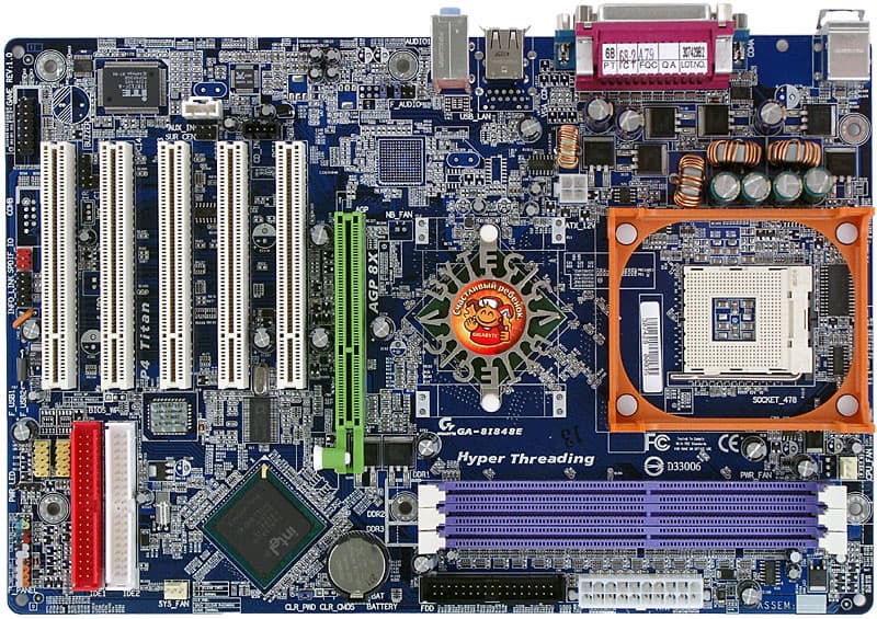 Gigabyte, как обычно, предлагает широкую линейку моделей на чипсете i848P (уж будем все-таки считать 8I848E основанной именно на этом наборе системной логики), включающую две пары на общих PCB: 8I848E и 8I848E-L (то же, плюс 100-мегабитный сетевой контроллер на чипе от Intel), а также 8I848P и 8I848P-L (различаются аналогично). Между собой эти пары различаются разводкой и функциональностью чипсета (в серии «P» применен более ожидаемый ICH5, а значит, в наличии 2 порта SATA и на 2 USB-порта больше), а северный мост, как и следовало ожидать, тоже может быть i865PE/i848P. Прямым следствием из наличия вышеописанных пар моделей являются нераспаянные на рассматриваемой плате микросхема сетевого контроллера с разъемом RJ45; нераспаянный разъем для подключения выносного COM-порта свидетельствует о том, что эта же PCB является основой для какой-то модели на чипсете с интегрированной графикой; также разведены, но не распаяны на 8I848E разъем WOL и перемычка для очистки CMOS. Размер платы — 305х205 мм («зауженный» ATX, крепление к корпусу шестью винтами, передний край платы может немного провисать). Наличие напряжения на разъемах модулей памяти индицируется светодиодом на плате, другой светодиод своим включением информирует об установке неподдерживаемой 3,3-вольтовой AGP-видеокарты. Для осуществления системного мониторинга используются возможности микросхемы ITE IT8712F-A. Контролируются: