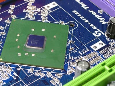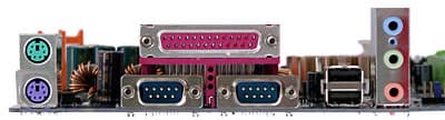Из-за того, что плата по ширине заметно заужена, в разводке ее есть несколько недостатков, хотя обычно модели со столь ограниченной функциональностью удается развести более удачно. Конкретные претензии у нас возникли к расположению IDE-разъемов за слотами PCI и аудиовходов — перед ними. Доступ к единственной имеющейся перемычке не затруднен даже при установке платы в корпус, краткое описание ее функциональности приведено на текстолите платы. В трехканальном импульсном стабилизаторе напряжения питания процессора применены 4 конденсатора по 3300 мкФ и 3 по 1500 мкФ. На плате также находятся стабилизаторы напряжения шины AGP (включающий 2 конденсатора по 1000 мкФ и несколько менее емких) и памяти (4 по 1000 мкФ).