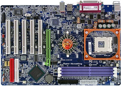 На попавшем к нам на тестирование образце мы наблюдаем применение северного моста i865PE. Объяснение ситуации очень простое: при дефиците чипов i848P и большом спросе на платы, основанные на этом заметно более дешевом MCH, Gigabyte распаивает на некоторых моделях более дорогой северный мост, удовлетворяя спрос (и, очевидно, не оставаясь все же внакладе). Технически ничего сложного в этом нет, так как i865PE и i848P не просто совместимы по разводке, но и представляют собой один и тот же кристалл, с заблокированным в i848P вторым каналом контроллера памяти. Со временем, когда проблема дефицита чипов исчезнет, можно ожидать окончательного перехода к выпуску упомянутых моделей только на i848P.