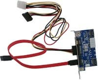 - Планку на заднюю панель компьютера с разъемами SATA (два интерфейсных разъема плюс один поставляемый в комплекте кабель со сдвоенным питанием: стандартным SATA и стандартным IDE);