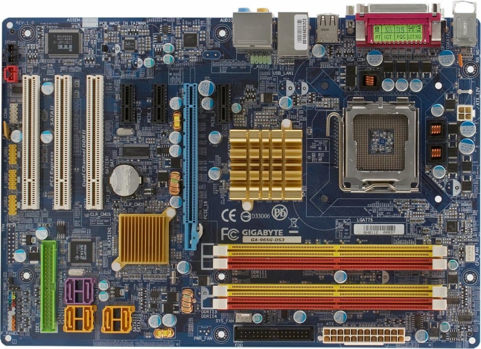 Даже на G965 Gigabyte выпускает целый ассортимент продуктов, включающий как microATX-модели (965GM-S2 и 965GM-DS2), далекие, впрочем, от бюджетного уровня, так и полноразмерные 965G-DS3 (2 ревизии) и 965G-DS4, причем последняя вполне может быть названа топовой, так как поддерживает, среди прочего, FireWire и CrossFire, а также имеет систему охлаждения элементов платы на тепловых трубках. В то же время, 965G-DS3 rev1.0 и 965G-DS3 rev2.0 различаются крайне незначительно (PCB и набор функций у них одинаковы, только дополнительные контроллеры иногда разные и у rev2.0 немного переделана схема питания процессора, ставшая, в частности, 6-канальной), а вообще вторые ревизии плат на P/G965 компания выпускает для гарантированной поддержки четырехъядерных процессоров Core 2. Более того, модели с аналогичными названиями на P965 и G965 основываются на самом деле на одной PCB, так что этот обзор смело можно распространять на Gigabyte 965P-DS3. Из разведенных, но нераспаянных элементов на текстолите 965G-DS3 есть только разъем для подключения модуля TPM (Trusted Platform Module, устройство с контроллером для проверки подлинности цифровых подписей и ключей, а также прочих функций шифрования и обеспечения безопасности) и третий разъем для подключения вентилятора.