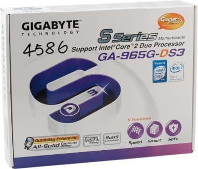 Любопытен подход Gigabyte к созданию 965G-DS3: это вроде бы обычная плата из S-серии, с исключительно бюджетной комплектацией и всего лишь средним набором дополнительных контроллеров. «S3» в названии модели означает применение трех «S-технологий», а по сути — не означает вообще ничего, так как под эти Speed/Smart/Safe маркетологи легко «подтягивают» абсолютно что угодно, а найти сегодня плату, не позволяющую автоматически регулировать частоту вращения кулеров, гибко разгонять систему из BIOS с повышением напряжений, прошивать BIOS из-под Windows и т. п., — крайне сложно. В то же время, прибавление к названию литеры «D» — совсем другое дело. В нынешней номенклатуре моделей компании «D» соответствует «Durability», то есть повышенной стабильности и надежности, а реализуется этот пункт применением во всех цепях платы исключительно качественных полимерных конденсаторов. Впервые мы столкнулись с такой особенностью у Gigabyte 965P-DQ6, но то все-таки была топовая модель, а теперь мы видим, что и в платах среднего, если вообще не бюджетного уровня реализуется аналогичный подход, и это нельзя не приветствовать. Повторимся, на наш взгляд, гораздо лучше привлекать покупателей таким образом, чем созданием вавилонских башен из набортных систем охлаждения или распайкой десятого RAID-контроллера. Приятно, что в нынешнем модельном ряду Gigabyte большинство новых плат (пока лишь для платформы Intel) имеют суффикс «D», хотя встречаются и их точные копии, этой особенности лишенные.