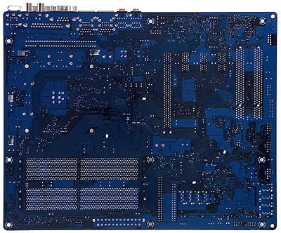 Разводка платы привычна — не совсем удобно расположен ряд разъемов вдоль левого края платы, разъемы FDD и PATA — позади разъема для видеокарты, а аудиоразъем — перед слотами PCI-E 1x. Доступ к перемычке не затруднен при установке платы в корпус, ее краткое описание приведено на текстолите. В четырехканальном импульсном стабилизаторе напряжения питания процессора применены 2 конденсатора по 1500 мкФ, 4 по 1000 мкФ и 9 по 560 мкФ. На плате находятся стабилизаторы напряжения шины PCI-E x16 (4 x 1000 мкФ) и памяти (6 x 1000 мкФ).