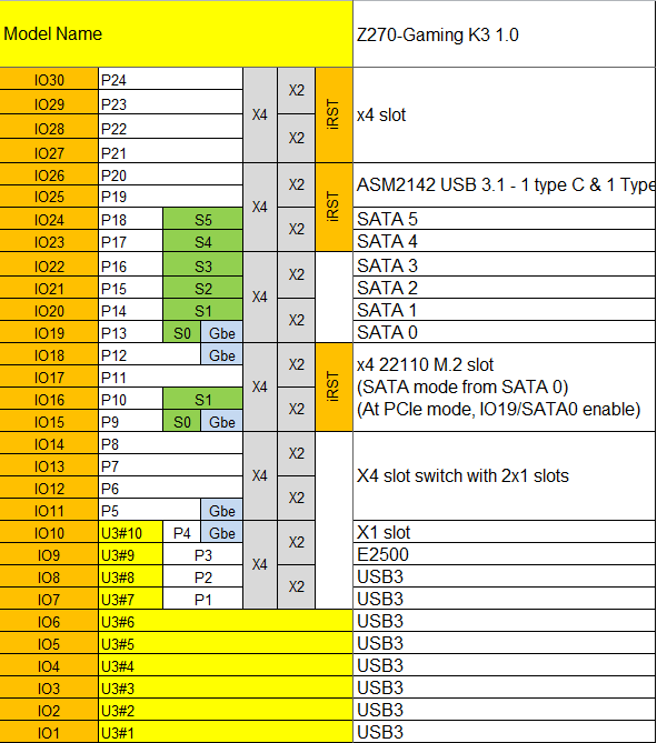 Для полноты картины представим также таблицу распределения HSIO-портов чипсета Intel Z270 на плате Gigabyte GA-Z270-Gaming K3. В данной таблице IO — HSIO-порт, P — PCIe-порт, S — SATA-порт и U3 — порт USB 3.0.