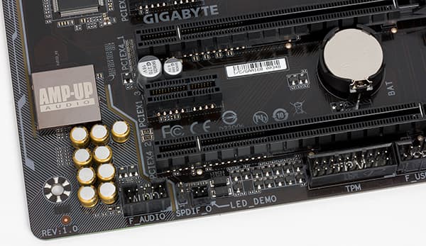 Аудиоподсистема платы Gigabyte GA-Z270-Gaming K3 основана на кодеке Realtek ALC1220. Никаких отдельных заменяемых операционных усилителей тут нет. Все элементы аудиотракта изолированы на уровне слоев PCB от прочих компонентов платы и выделены в отдельную зону.