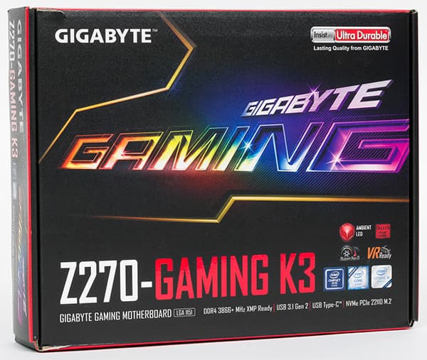 Плата Gigabyte GA-Z270-Gaming K3 поставляется в небольшой по размерам коробке, на которой красноречиво расписаны все ее достоинства.