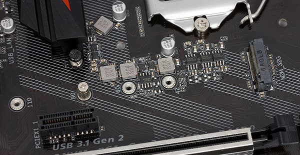 Разъем M.2 предназначен для установки SSD-накопителей. Разъем реализован через чипсет и поддерживает накопители типоразмера 2242/2260/2280/22110 с интерфейсом PCIe 3.0 x4 и SATA.