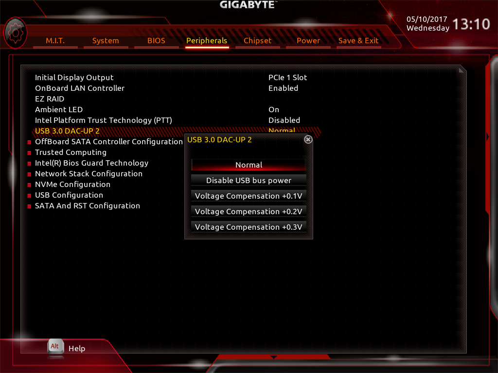 Пожалуй, главная особенность Gigabyte GA-Z270-Gaming K3 заключается в реализации технологии USB 3.0 DAC-UP 2. Смысл этой технологии в том, что на задней панели платы имеется два выделенных порта USB 3.0 (они маркируются желтым цветом), для которых можно немного повышать выходное напряжение. В настройках UEFI BIOS имеется возможность увеличить выходное напряжение (задать компенсационное увеличение) на 0,1, 0,2 и 0,3 В.