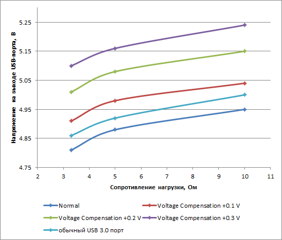 Кроме того, мы измерили напряжение на выходе обычного USB-порта и USB-порта с технологией USB 3.0 DAC-UP 2 для трех нагрузок: 3,3 Ом, 5 Ом и 10 Ом. Результаты тестирования представлены на графике.