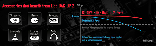 В рекламных материалах компании утверждается, что технология USB 3.0 DAC-UP 2 позволяет повысить стабильность напряжения на портах USB и улучшает передачу сигнала по USB-кабелю. Те же рекламные материалы Gigabyte сообщают, что нужно это для компенсации падения напряжения, которое возникает по мере увеличения длины USB-кабеля. Приводится даже график зависимости падения напряжения от длины USB-кабеля для обычных USB-портов и для портов с технологией USB 3.0 DAC-UP 2.