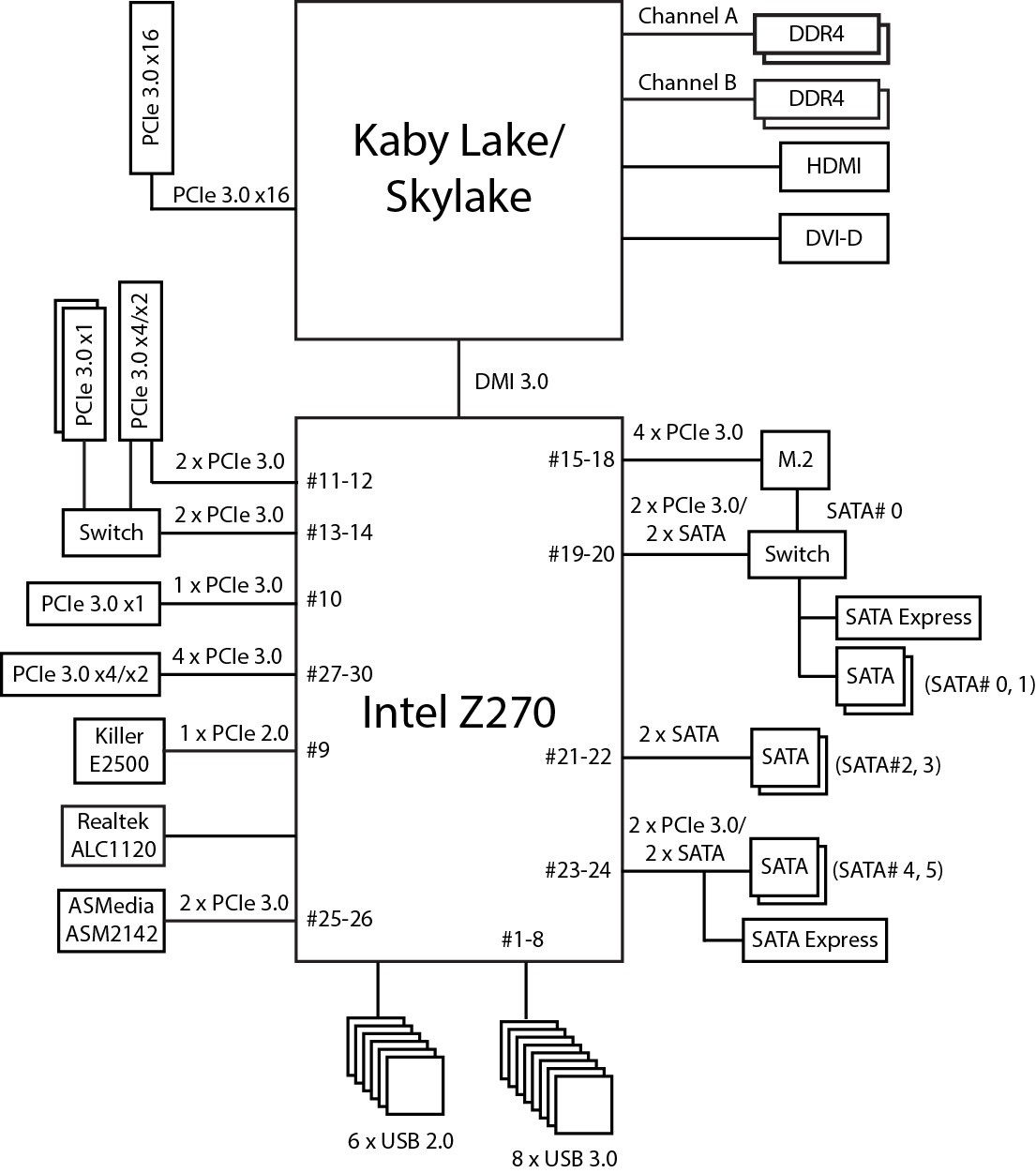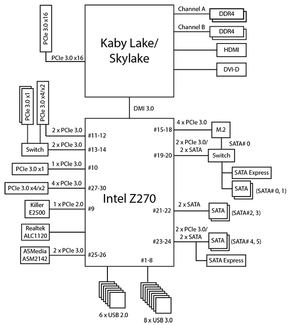 Напомним, что чипсет Intel Z270 имеет 30 высокоскоростных портов ввода/вывода (HSIO), в качестве которых могут быть порты PCIe 3.0, USB 3.0 и SATA 6 Гбит/с. Часть портов строго фиксировано, но есть HSIO-порты, которые могут конфигурироваться, как USB 3.0 или PCIe 3.0, SATA или PCIe 3.0. Причем всего может быть не более 10 портов USB 3.0, не более 6 портов SATA и не более 24 портов PCIe 3.0.