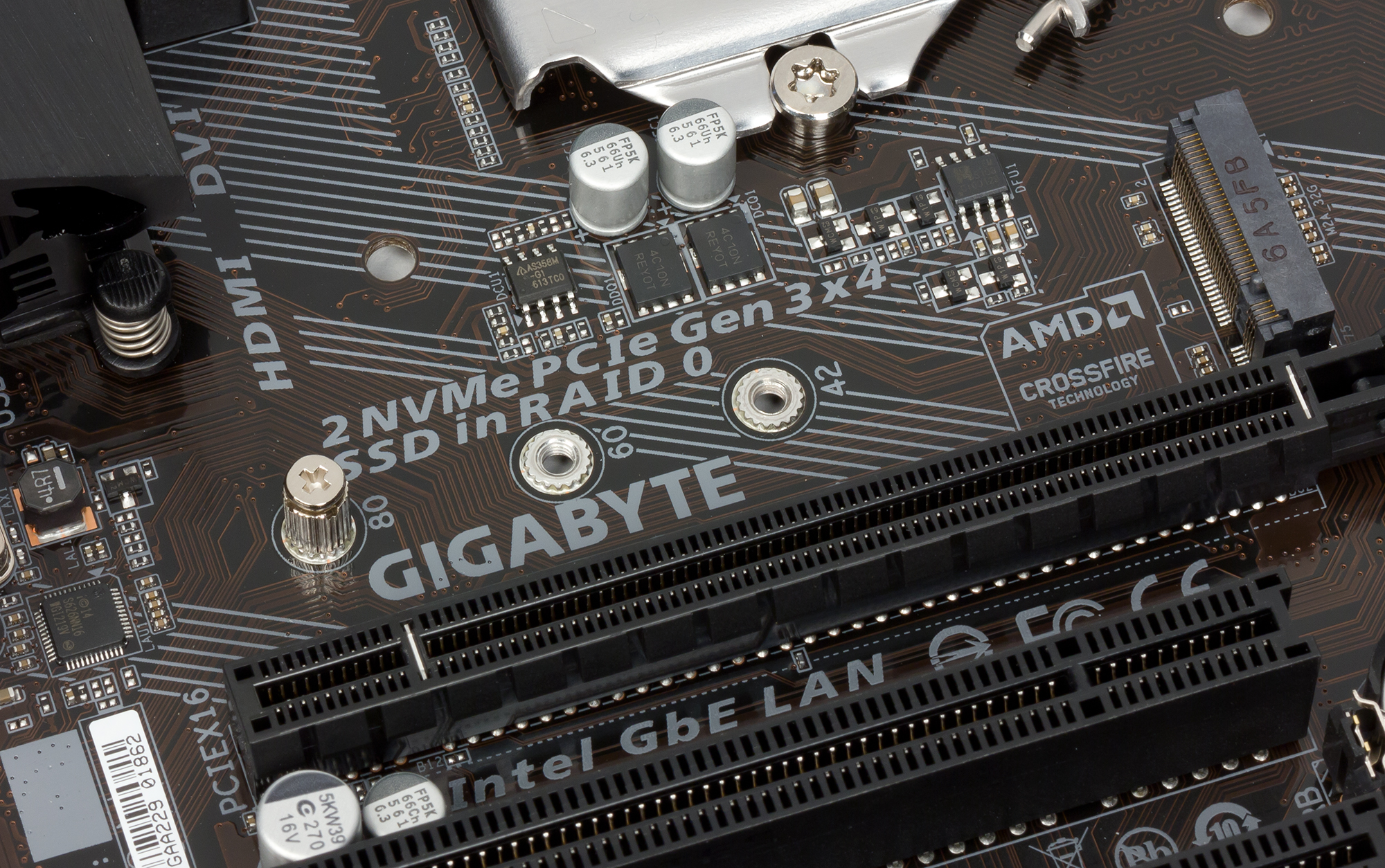 Для установки видеокарт, плат расширения и накопителей на материнской плате Gigabyte GA-Z270M-D3H имеется два слота с форм-фактором PCI Express x16, два слота PCI и разъем M.2.