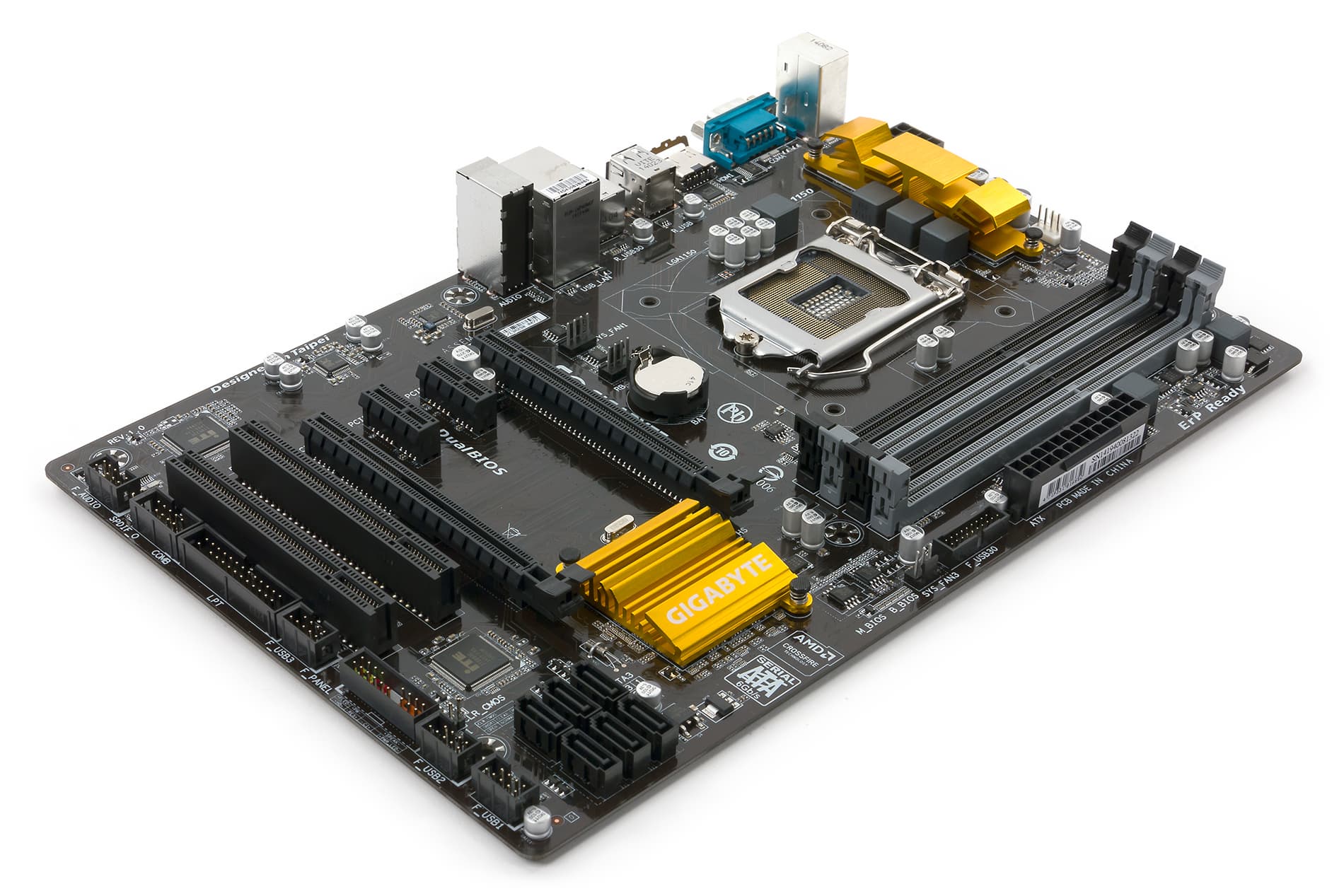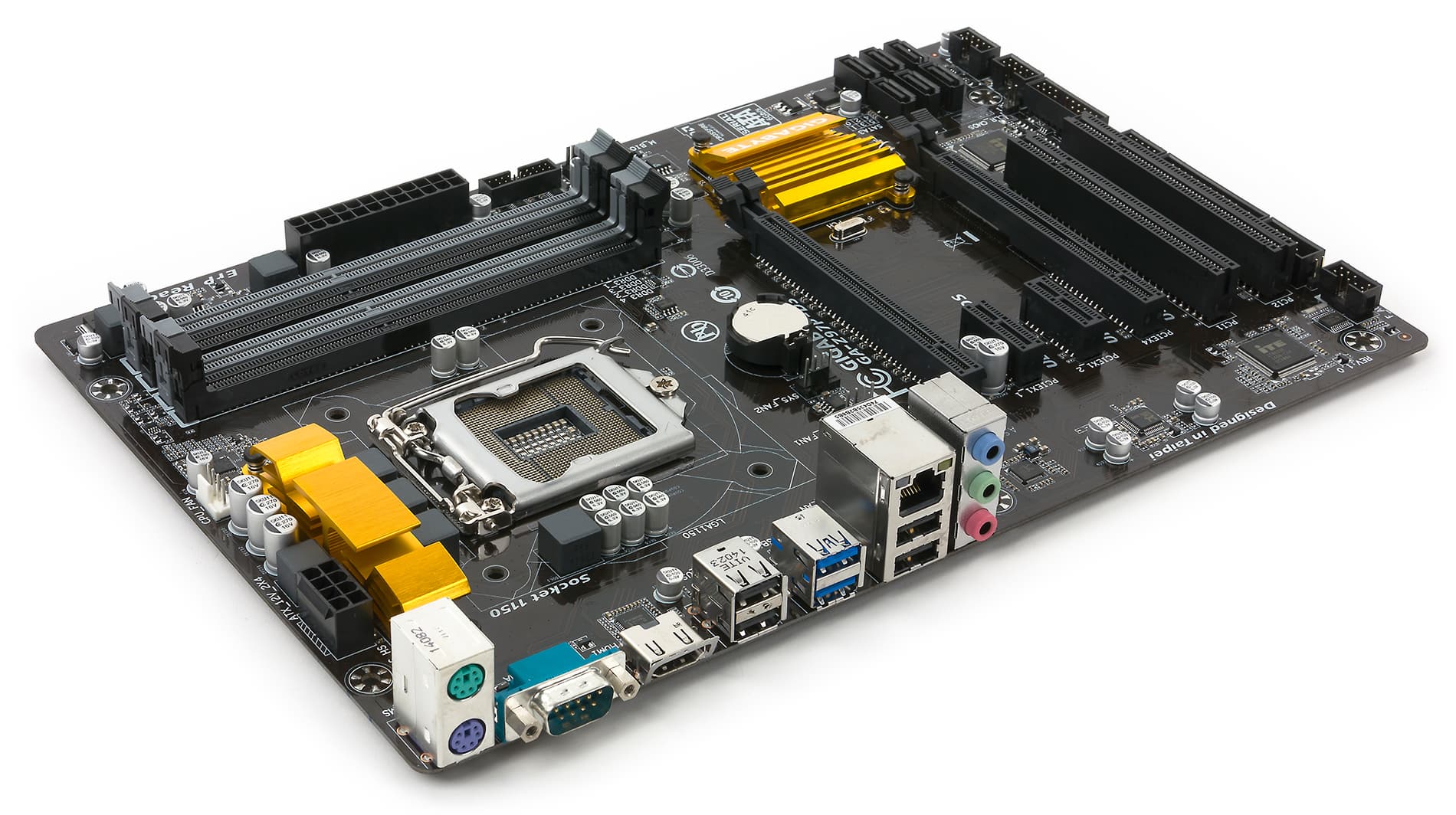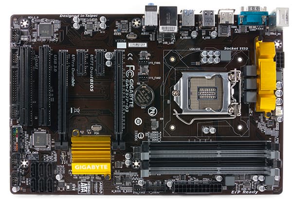 Плата Gigabyte Z97P-D3 выполнена в форм-факторе ATX (305 × 200 мм), а для ее монтажа в корпус предусмотрены шесть отверстий. За счет того, что размер платы довольно необычный (200 мм по короткой стороне), она выглядит чрезмерно вытянутой. Кроме того, из-за крепления только на шесть точек (в обычных платах ATX (305 × 244 мм) используется девять отверстий) передний край платы немного провисает, что становится заметно при установке модулей памяти в крайние разъемы и при подключении кабелей к разъемам на этой части текстолита.