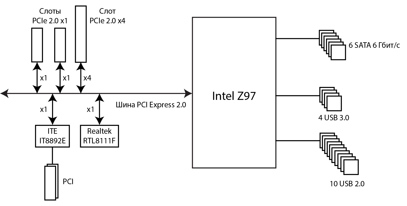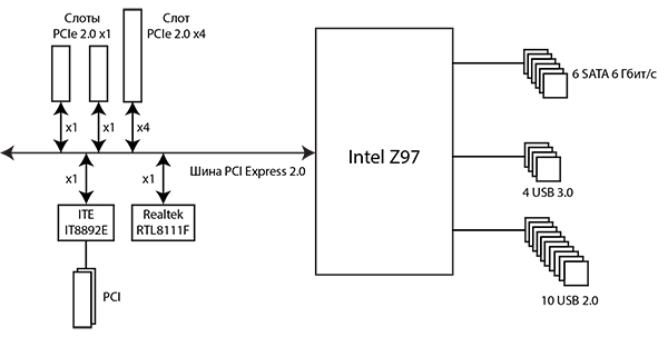 Схема подключения всех контроллеров слотов и разъемов к чипсету Intel Z97 показана на рисунке.