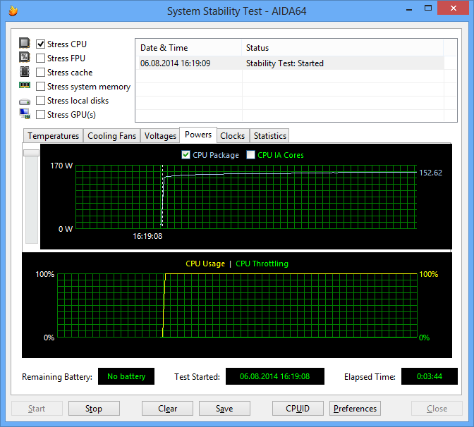 В тесте Stress FPU, который в большей степени нагревает процессор, температура ядер достигает критического значения и наблюдается троттлинг. Энергопотребление процессора в этом режиме составляет уже 175 Вт. Кстати, интересно отметить, что на плате Gigabyte Z97X-UD3H тест Stress FPU нам запустить вообще не удалось (система сразу же «падала»).