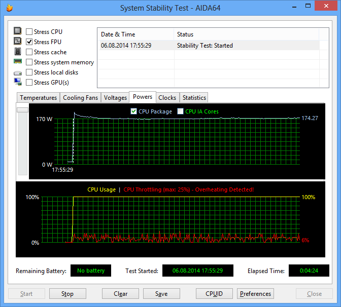 Впрочем, при загрузке процессора тестом Stress FPU все-таки достигается критическое значение температуры и наблюдается троттлинг. Энергопотребление процессора в этом режиме составляет те же 175 Вт.