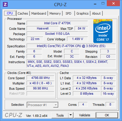 Мы разгоняли на плате Gigabyte Z97P-D3 разблокированный процессор Intel Core i7-4770K. Прежде всего, отметим, что в случае разгона процессора только лишь путем изменения коэффициента умножения (все остальные параметры в режиме Auto), проявляется та же самая проблема, что и на других платах Gigabyte. Эта проблема заключается в том, что напряжение питания ядер процессора (Core Voltage), которое в этом случае устанавливается автоматически, оказывается сильно завышенным. Так, если установить коэффициент умножения равным 48, то напряжение питания ядер процессора составит 1,499 В, что, вообще-то, многовато. Естественно, при такой частоте и таком напряжении питания процессор сильно нагревается под нагрузкой, и сильно возрастает его энергопотребление . В частности, при загрузке процессора тестом Stress CPU (пакет AIDA64) температура ядер процессора составляет порядка 95 °C (при охлаждении нашим стандартным кулером тестового стенда), а энергопотребление процессора составляет 152 Вт. И это при том, что тест Stress CPU нельзя назвать очень сильной нагрузкой процессора. Отметим, что на плате Gigabyte Z97X-UD3H в тех же условиях разгона процессора энергопотребление составляло 114 Вт.
