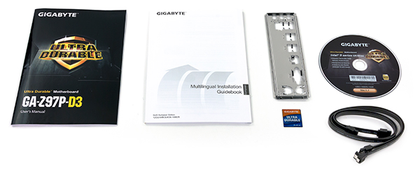 Платы Gigabyte Z97P-D3 поставляется в стандартной (для компании Gigabyte) компактной картонной коробке черного цвета, на которой расписаны все ее достоинства и даже приводится краткая спецификация. Комплект поставки минимальный: кроме самой платы имеется лишь инструкция пользователя, DVD-диск с программным обеспечением и драйверами, два SATA-кабеля (все разъемы с защелками, один кабель имеет угловой разъем с одной стороны) и заглушка задней панели платы.