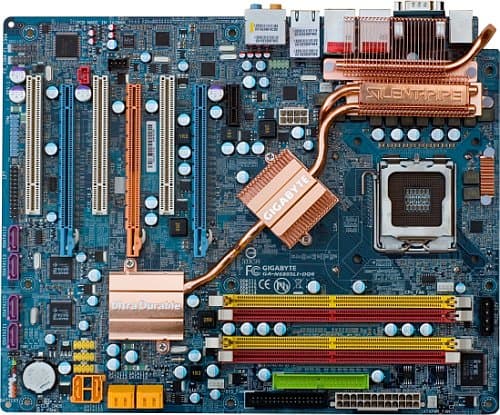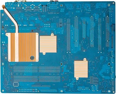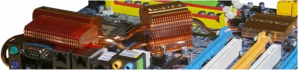 Охлаждение северного и южного моста, а также полевых транзисторов стабилизатора питания процессора — пассивное. Радиаторы на обоих мостах чипсета представляют собой медную пластину (радиатор на северном мосту вдобавок имеет значительное количество тонких медных ребер-пластин большой площади), соединенную собственной тепловой трубкой с нижней половиной сложного радиатора на полевых транзисторах около процессорного сокета. Верхняя половина этого радиатора собственной тепловой трубкой соединена с радиатором на обратной стороне процессорного сокета, а между собой половинки соединены двумя плоскими выступами из основания, проложенными теплопроводящей прокладкой и скрепленными двумя подпружиненными винтами. В дополнение, с оборотной стороны платы установлены небольшие алюминиевые радиаторы в районе мостов чипсета — по-видимому, они символизируют стремление инженеров Gigabyte к гармонии и красоте, поскольку функциональность у них нулевая: с горячими радиаторами на мостах они связаны лишь посредством крепежных винтов, и даже практически не касаются платы (в отличие от радиатора под процессорным сокетом, который прижат к плате через теплопроводящую прокладку).