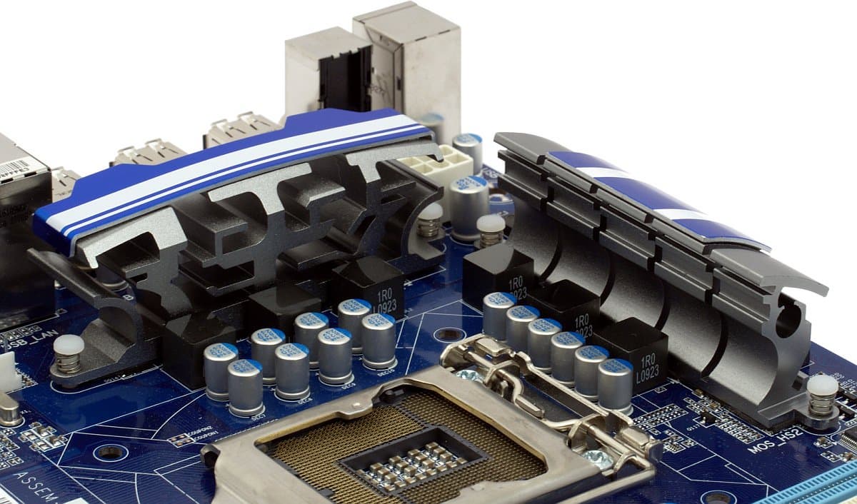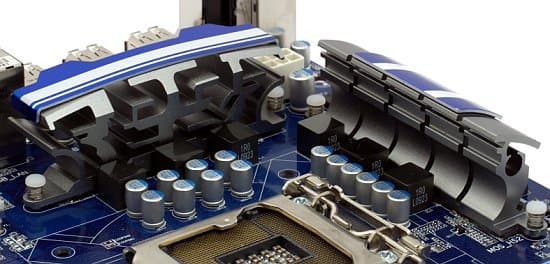 А вот к набортной системе охлаждения никаких претензий нет. Платы P55-UD3 не относятся к топовым, так что могут себе позволить эффективное охлаждение, а не эффектное, пример которого мы наблюдали у P55-UD6. Правда, P55-UD3R и P55-UD3P все-таки имеют по тепловой трубке, очевидно бесполезно соединяющей радиаторы на полевых транзисторах в цепи питания процессора, но эта трубка там, по крайней мере, не мешается при сборке системы. На рассматриваемой же сегодня P55-UD3 установлены три отдельных алюминиевых радиатора (третий — на чипсете) с замысловатым профилем, которые крепятся к плате пластмассовыми защелками, а не нормальными металлическими винтами, но бюджетной плате это вполне можно простить. При работе нагрев радиаторов едва ощущается.