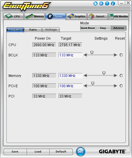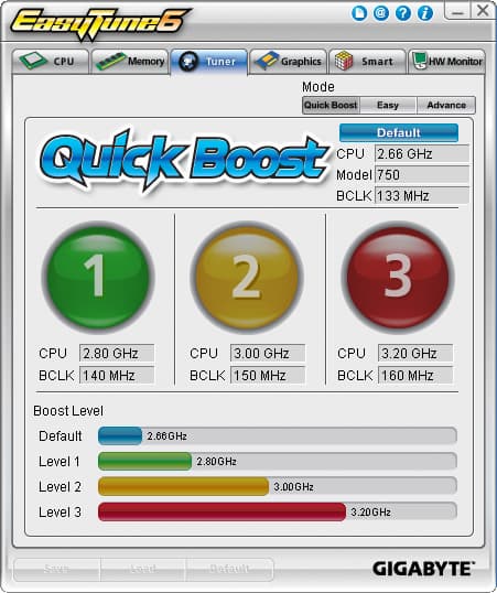 К чему у нас нет ни малейших замечаний, так это к фирменной утилите EasyTune 6. Отличная программа с вменяемым интерфейсом, выводом огромного количества справочной низкоуровневой информации о системе (полностью заменяет CPU-Z) и расширенным мониторингом. Кроме того, позволяет достаточно гибко настраивать «умную» работу вентиляторов. Ну и, разумеется, разгон на любой вкус: простой выбор одной из предустановок для небольшого, но почти гарантированного разгона; быстрое увеличение опорной частоты с автоматическим подъемом напряжений; динамический разгон с настройкой агрессивности алгоритма; полностью ручной режим, где можно задать желаемые параметры с точностью до мегагерца и милливатта. Ради таких утилит безусловно стóит вставить комплектный DVD в привод.