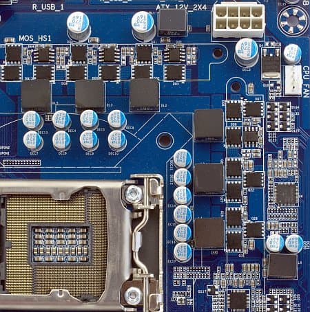 Стабилизатор питания процессора на бюджетной плате, конечно, куда менее сложен, чем на топовых решениях, ориентированных на рекордный разгон. Схема стабилизатора в данном случае выглядит как 4+2 (4-канальное питание ядра процессора и 2-канальное питание Uncore-логики), с тремя полевыми транзисторами в каждом канале. Конвертер питания модулей памяти также двухканальный. В целом — вполне адекватная схема, хотя и не гарантирующая сверхвысокой стабильности напряжения при сильном разгоне. Кроме того, плата реализует все преимущества серии Ultra Durable 3: увеличенную толщину слоев питания и заземления в печатной плате, полимерные конденсаторы японского производства (Nichicon) с повышенным сроком службы, полевые транзисторы с низким сопротивлением открытого канала (RDS(ON)), дроссели с ферритовым сердечником. Все модели семейства P55-UD3 имеют похожую схему преобразователей напряжения в ключевых цепях, но у старших увеличено количество каналов, а у младших применяются менее «прогрессивные» компоненты (скажем, используются стандартные полевики), причем у P55-US3L даже и оставшиеся (полимерные конденсаторы) применяются лишь в цепи питания процессора, а не по всей плате.