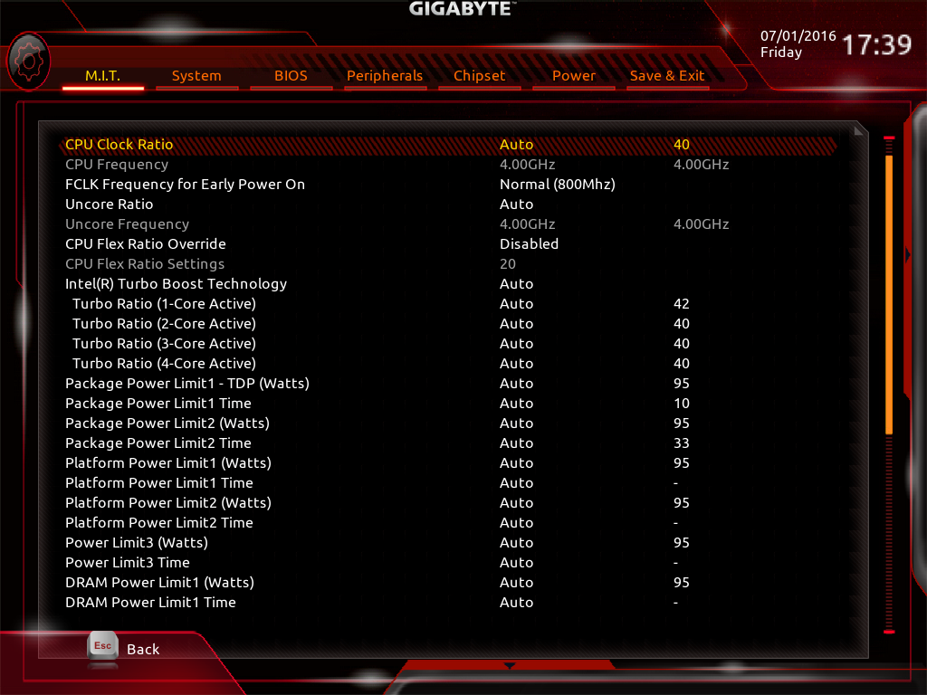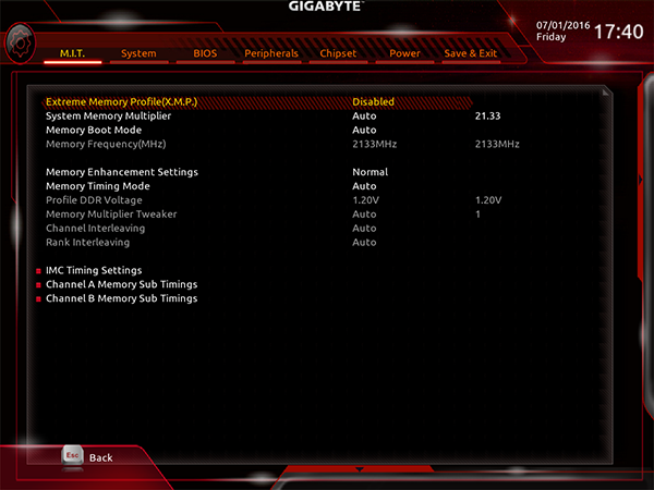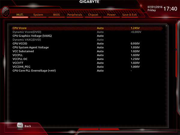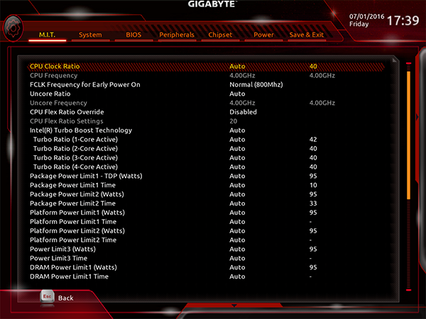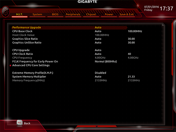 UEFI BIOS платы Gigabyte Z170X-Designare вполне типичен в плане возможностей по разгону и настройке системы. Интерфейс имеет шесть вкладок, а все возможности по разгону системы сгруппированы на вкладке M.I.T.