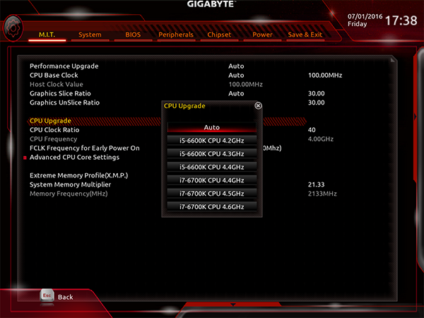 На этой вкладке можно выбрать пресет для разгона процессора с разблокированным коэффициентом умножения. В частности, для процессора Core i7-6700K предлагается пресет по разгону до частоты 4,6 ГГц.