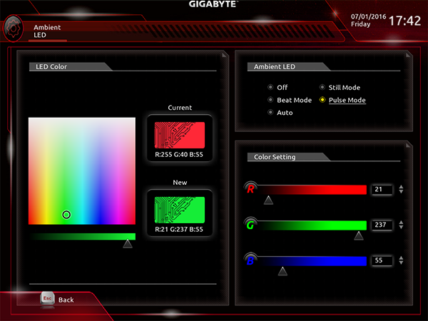 В UEFI BIOS есть возможность задать цвет подсветки и выбрать схему работы. Что касается цвета, то тут практически нет ограничений. Стандартная схема управления цветом позволяет задать каждый из основных цветов (R, G, B) в 256 градациях, то есть всего 16,7 млн цветов. Но это в теории. На практике создается ощущение, что реальных цветов существенно меньше, да и выбранный цвет может сильно отличаться от того, который будет реально наблюдаться.
