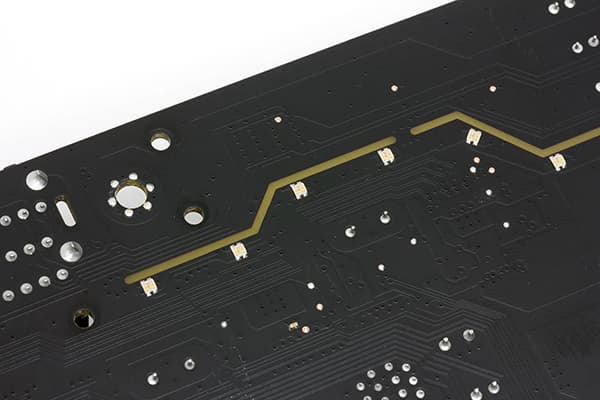 Есть у данной платы и еще одна новомодная «фишка». Речь идет о реализации RGB-подсветки с использованием панелей из светодиодов. С обратной стороны платы у передней и задней кромок расположен ряд светодиодов, которые подсвечивают плату. Кроме того, с лицевой стороны платы по передней кромке и по границе аудиотракта в текстолите имеется полупрозрачная полоса, которая подсвечивается уже упоминавшимися светодиодами.