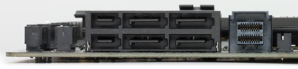 Для подключения накопителей или оптических приводов на плате предусмотрено в совокупности шесть портов SATA 6 Гбит/с. Это два отдельных порта SATA 6 Гбит/с и еще четыре порта SATA 6 Гбит/с в составе двух разъемов SATA Express.