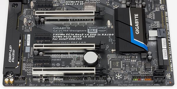 Вообще, нужно отметить, что схема разделения высокоскоростных портов ввода/вывода, реализованная на плате Gigabyte Z170X-Designare, довольно интересная. Все порты SATA переконфигурируемы с портами PCIe. И данная схема позволяет одновременно задействовать слот PCI Express 3.0 x4, разъем M.2 в режиме PCIe 3.0 x4 и разъем U.2. Почему это важно? Да просто используя указанные разъемы можно установить на плату сразу три NVMe SSD накопителя и объединить их в RAID-массив по технологии Intel RST 14.0.