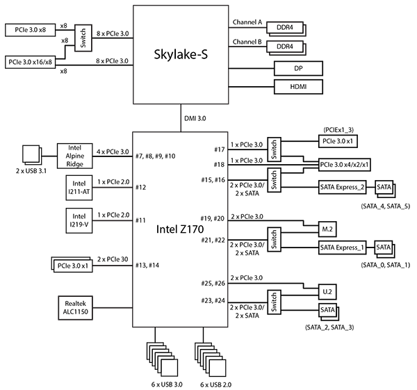 Чипсет Intel Z170 обеспечивает до 20 портов (линий) PCIe 3.0, до 10 портов USB 3.0 и до 6 портов SATA 6 Гбит/с. Причем всего может быть не более 26 высокоскоростных портов (PCIe 3.0, USB 3.0 и SATA 6 Гбит/с). Есть и еще одно ограничение, которое связано с тем, что к 20 чипсетным портам PCIe можно подключить только 16 PCIe устройств (контроллеров, разъемов и слотов). Часть высокоскоростных портов чипсета строго фиксированы, а часть портов переконфигурируемы — они могут быть портами PCIe 3.0/USB 3.0 или портами PCIe 3.0/SATA 6 Гбит/с (называется Flexible I/O).