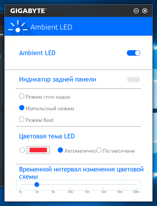Управлять подсветкой можно не только через UEFI BIOS, но и через специальную утилиту Ambient LED. Возможности по настройке с использованием данной утилиты немного отличаются (хотя режим Beat Mode и тут не работает). Так, можно задавать еще и временной интервал изменения цветовой схемы.