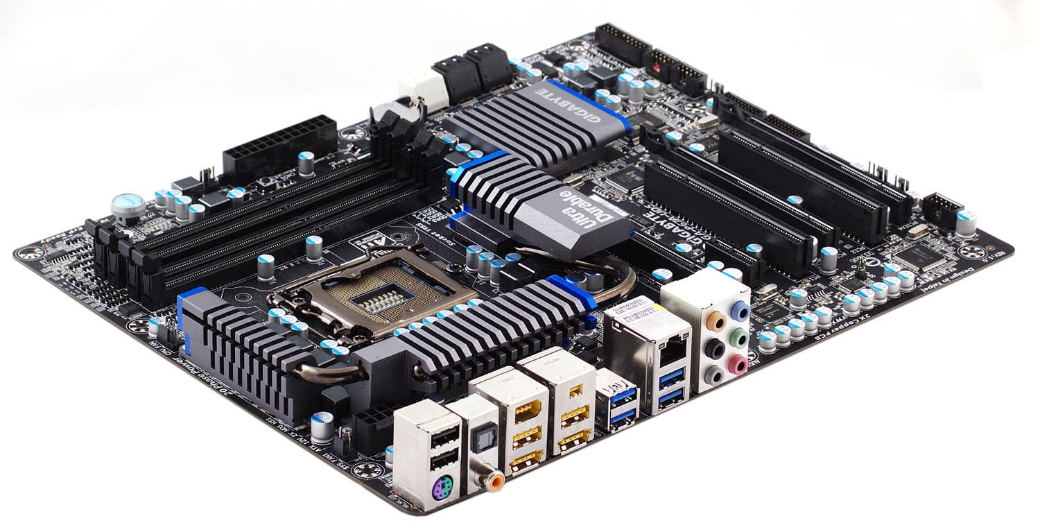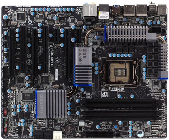 Первое, что сразу бросается в глаза — необычный для Gigabyte цвет печатной платы. Да, теперь и эта компания может порадовать покупателей черными РСВ в топовой серии, что мы можем только приветствовать: все-таки ранее платы были слишком уж яркими. А теперь — элегантное благородство черного цвета и у самой платы, и у всех слотов (PCI, PCIe и памяти), и даже у большинства разъемов. Понятно, что для практического использования цвет не имеет решающего значения, но первое впечатление сильно улучшилось :) На что и рассчитано.