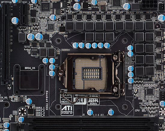 Зато раскладка слотов по сравнению с предыдущим поколением плат не изменилась абсолютно, что мы приветствовать никак не можем. Скорее, наоборот — потому что сохранились оба старых недостатка схемы. Во-первых, самый верхний PCIe х1 использовать практически нереально — в него войдут только самые короткие карты. А установка более длинных невозможна из-за того, что сзади расположен один из четырех радиаторов системы охлаждения. Красивой, но, на наш взгляд, излишней. Тем более, что конкретно этот радиатор на UD5 лишь косвенным образом участвует в охлаждении — как было показано на фотографии выше, «накрывает» он не что иное, как пустое место. Да, именно так — чипсет «переехал» за слоты, но сильно переделывать систему охлаждения компания не стала. Впрочем, для старшей P67A-UD7 это оправдано — на месте под радиатором расположен мост nForce 200, славный своим высоким энергопотреблением, зато позволяющий получить схемы работы PCIe типа х16+х16, х16+х8+х8 или х8+х8+х8+х8 (чтоб владельцы всяких там экстремальных плат на Х58 не пытались нос задирать :)). Но на UD5 этого чипа нет, а вот система охлаждения та же со всеми вытекающими отсюда последствиями.