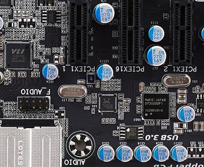 - контроллер USB 3.0 Renesas D720200 (в девичестве — NEC µPD720200F1, интерфейс PCIe x1) и два четырехпортовых хаба VLI VL810 (подключены к выходам контроллера Renesas), обеспечивающие четыре внешних порта (синего цвета) на задней панели и четыре внутренних