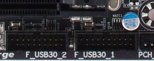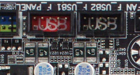 Пару таких портов можно найти практически на всех современных платах высокого уровня у Gigabyte, не стала исключением и P67A-UD5: внутренний разъем, подкрашенный красным, их и обеспечивает.