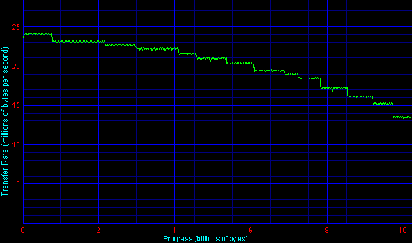 Мы видим здесь "кардиограмму инфарктника" на первой половине графика (чего в теории вроде бы быть не должно) и "идеологически верную" вторую половину, скорость считывания в каждой точке которой равна утроенной скорости считывания одного диска.