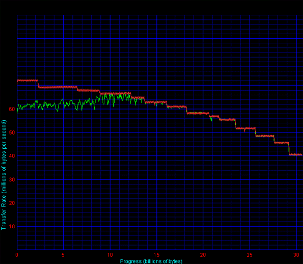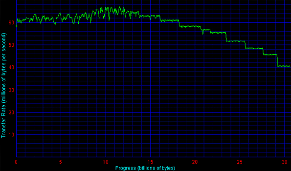 Не правда ли, интересная картина? Это уже гораздо меньше похоже на пресловутую "кардиограмму", но, тем не менее, мы наблюдаем явное ограничение скорости вблизи границы пропускной способности ATA66 (не стоит забывать, что теоретические 66.6 Mбайт/с — т.н. "пиковая" пропускная способность, в реальности она, как правило, несколько ниже — как раз на уровне 58 — 63 Mбайт/с).