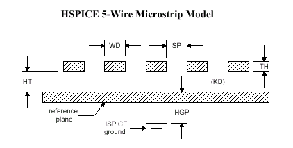 Данная планарная геометрическая модель (HSPICE Five-Wire Planar Geometric Model) описывается в среде HSPICE как "секция" (определенный отрезок сигнальной линии фиксированной длины, элемент), характеризующая моделируемый участок и учитывающая все основные параметры микрополосковой линии: количество слоев (NLAY), длину "секции" (L), расстояние между соседними проводниками, (SP), ширину (WD) и толщину отдельного проводника (TH), сопротивление материала проводника (RHO), толщину диэлектрического слоя (HT), относительную диэлектрическую проницаемость (KD) и т.д. — всего 16 параметров.