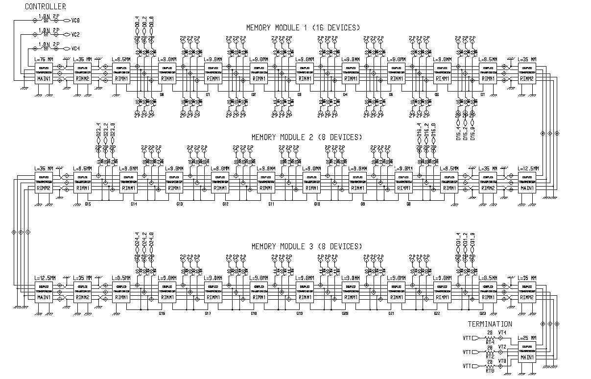 Исходя из имеющейся документации была проведена небольшая оптимизация трассировки сигнальных линий по базовой плате и модулю памяти с целью идеализирования модели и оптимизации репродукций на максимальную производительность — действительная и рекомендуемая конфигурация подсистем памяти могут несколько различаться с рассматриваемыми схемами RAMBus и SLBus. Так, активные компоненты не использовались (сугубо линейная схема, описывающая исключительно топологию шины), источник CMOS-сигнала SLDRAM представлен, как идеальный источник напряжения с последовательным сопротивлением и емкостной нагрузкой 2pF на вывод, а источник сигнала DRDRAM представлен, как идеальный источник тока с емкостным ограничением 2pF на вывод. Монтажные отверстия в печатной плате и контактные площадки для пайки представлены идеальными емкостями между сигнальной линией и "землей" (эти емкости по 0.5pF показаны на схеме в виде маленьких ромбиков с точкой подсоединения в центре). В процессе исследования было обнаружено, что наличие малой сосредоточенной емкости, распределенной вдоль шин, оказывает малое влияние на результаты моделирования. Характеристики каждой моделируемой шины зависят главным образом от длины отрезков линий и емкости, образованной контактной площадкой в конце трассы.