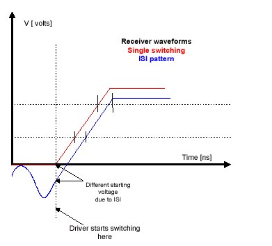 В момент прихода сигнала от источника из-за межсимвольной интерференции в линии еще присутствует небольшое отрицательное напряжение. Поэтому результирующий логический уровень окажется заниженным и четко установится с некоторой временной задержкой. Таким образом, межсимвольная интерференция является одной из основный проблем при разработке высокоскоростных схем, в которых период следования сигнала меньше времени задержки в линии передачи.