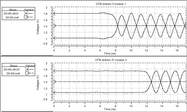 Интересной особенностью является уменьшение амплитуды и полосы пропускания синхросигнала по всей длине структуры RAMBus, что связано с 30% затуханием сигнала (что неудивительно, принимая во внимание общую протяженность сигнальной линии) и 10ns периодом обращения. Поскольку форма тактового сигнала на котроллере отличается от формы сигнала записываемых данных, сдвиг между ними (Clock-to-Data Skew) закладывается как распространение основных сигналов на дальнем конце шины. Идеально четкое пересечение дифференциальных сигналов по уровню опорного напряжения для записываемых данных у контроллера сменяется 80ps отставанием (Reference-Level Crossing Lag) на дальнем конце шины (последнее устройство), в то время как считываемые данные на контроллере имеют 40ps опережение по опорному уровню (Reference-Level Crossing Lead). Эти маленькие перекосы кажутся незначительными, однако не могут быть проигнорированы в силу того, что в сумме составляют около 6% от номинального периода передачи данных — таким образом, они введены в общий временной сдвиг по RAMBus в таблице итоговых параметров сигнала.