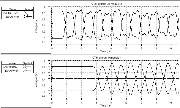 В структуре SLDRAM синхросигнал и данные четко согласованы, поскольку они берут начало от одного источника формирования и проходят абсолютно одинаковую дистанцию. В отличие от шины SLBus, синхросигналы структуры RAMBus проходят в два раза большее расстояние, нежели данные, в результате чего возникает необходимость проведения дополнительного моделирования. Поэтому была введена еще одна группа диаграмм, показывающая поведение дифференциальных тактовых сигналов в схеме синхронизации узлов DRDRAM при движении их к концу шины и возвращению назад: первая диаграмма демонстрирует "прямой" сигнал (CTM — Clock To Master) на последнем устройстве в канале (последняя микросхема) возле терминатора и формирователя синхросигнала; вторая диаграмма показывает поведение CTM на первой микросхеме в канале, возле контроллера, в конце шины; третья диаграмма демонстрирует обратный ход синхросигнала (CFM — Clock From Master) на первом приборе в конце шины; и последняя диаграмма отражает CFM на последней микросхеме, возле терминатора.