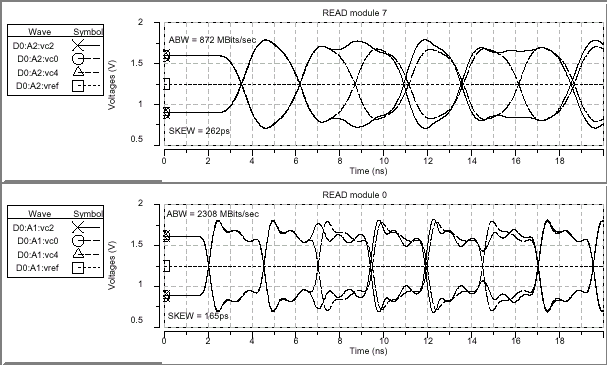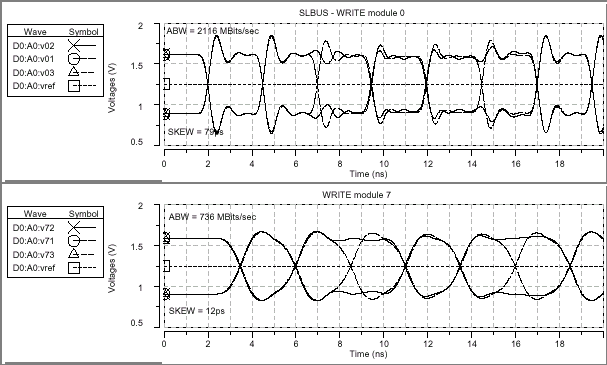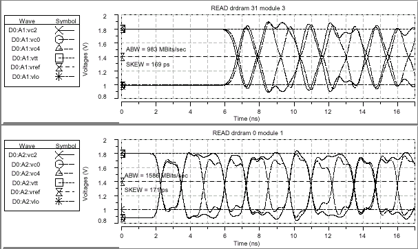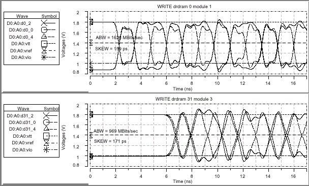 Конечными результатами данного исследования являются получение значений перекоса данных на шине и действительной пропускной способности — самых важных характеристик эффективности любой шинной структуры. Как уже говорилось, проводимое моделирование не допускает влияние цепей управления таймингами или рассогласования по амплитуде; паразитного всплеска синхросигнала в приемнике или передатчике; вариации от трассы к трассе на основной плате, разъемах, контактных площадках и модулях; терминирующего рассогласования, а также VREF и VTERM ошибок протокола или шума — никаких подобных специальных дисбалансных параметров или предискажений сигнала не вводилось. Данные результаты характеризуют исключительно саму структуру в лучших из возможных условий с идеальными компонентами и полностью помехозащищенной средой.