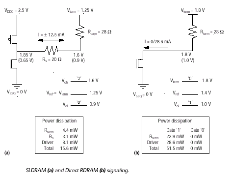 В схеме RAMBus применяется 28 Ом нагрузка, подтягивающая уровень напряжения на к VTERM (1.8V) в отсутствие сигнала для обеспечения логического "0". Любое устройство на шине может установить логическую "1", подключив источник тока 28.6mA, используя n-канальную структуру, основанную на МДП-транзисторе с открытым ненагруженным стоком (Open-Drain NMOS Structure). Каждое такое устройство на шине может подстраивать величину этого тока для удержания логической разности между логическими уровнями в 0.8V, поэтому при низком уровне сигнала на каждой линии рассеивается 51.5mW, а максимальная потребляемая мощность (при условии передачи всех "1") в 18bit шине составляет 0.93W. Так, максимальная выходная мощность одной микросхемы составляет 0.51W, и абсолютно не потребляется, когда на шине установлен уровень VTERM (передача всех "0"). Для случая средней нагрузки (типичный набор данных с соотношением "0" и "1" пополам) потребляемая мощность составляет 0.46W, из которых 0.26W потребляется только микросхемой.